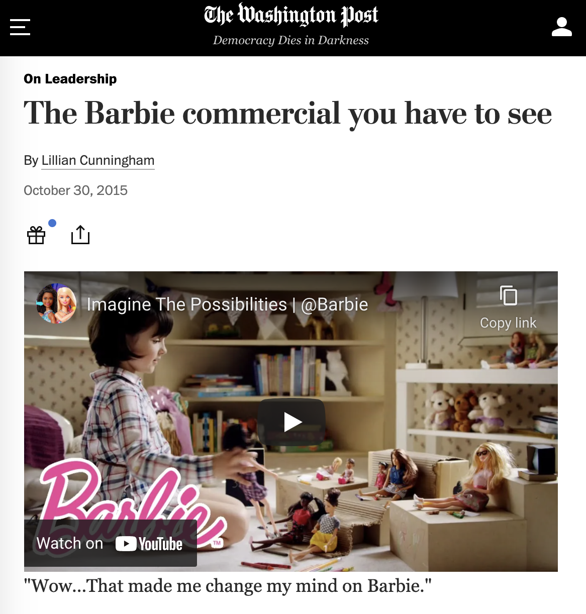 With Barbie sales in decline, the 50-year doll was struggling to win over millennial moms. Our film aimed to change the conversation and remind parents that when a girl plays with Barbie she imagines anything she wants to become.