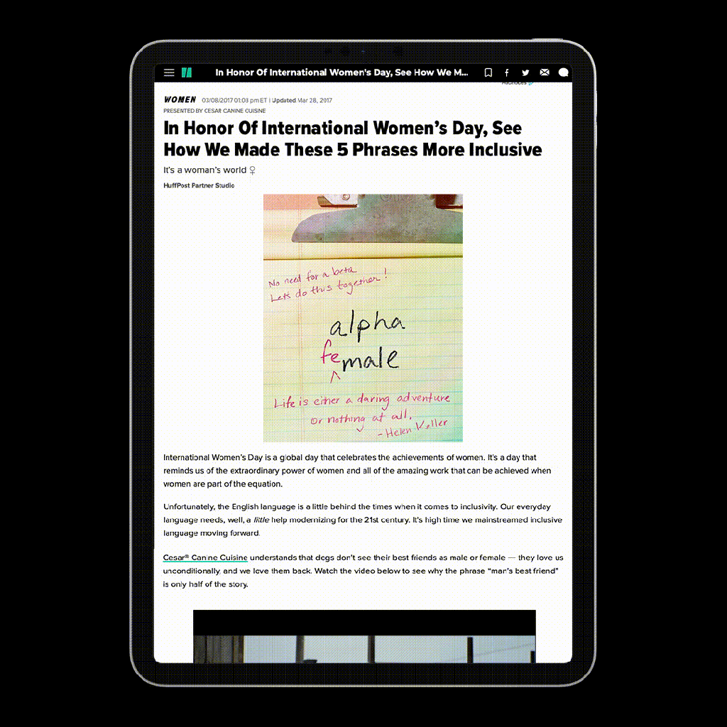 For centuries we’ve been saying that dogs are “man’s best friend.” But that’s only half the story. So we went back to the origin of the phrase—a famous courtroom speech delivered by George Vest in 1870—and used those words to tell the true stories of 7 real women and their best friends. For a launch on International Women’s Day we partnered with The Dogist to capture women and their dogs, and The Huffington Post to highlight outdate, male-centric phrases that also should be reconsidered.
